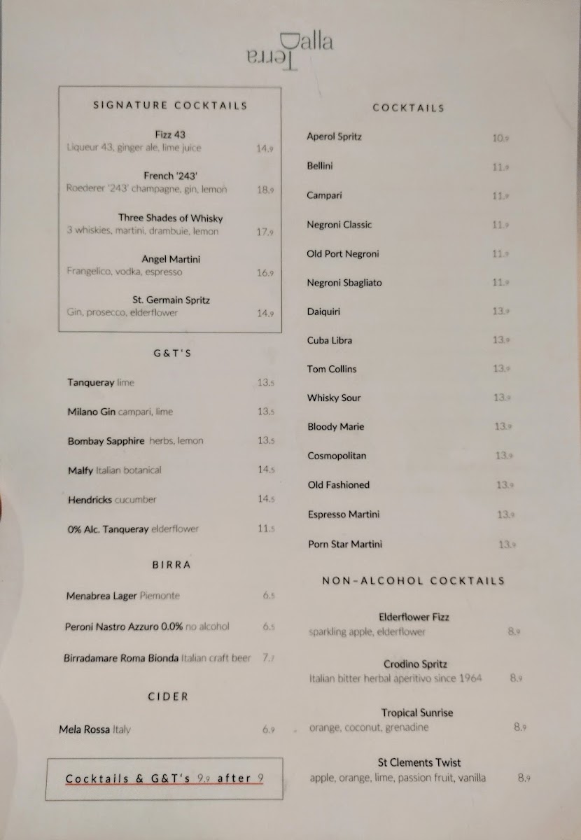 Pimm’s, Negroni Classic, Negroski Vodka, Negroni Sbagliato, Negroni ‘Old Port’, Tom Collins, Manhattan, Martini, Espresso Martini, Porn Star Martini, Old Fashioned, Grey Goose Vodka & Tonic, Grey Goose ‘Screwdriver’, Champagne Cocktail